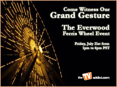 The folks over at Save Everwood have finally confirmed when and where the Grand Gesture will take place. If you’re in the LA area on Friday July 21st between 1 and 6pm and you see a Ferris Wheel in a surprising place, you may wish to stop by. The cast, crew and creative team from EVERWOOD have all been invited to help show the CW (and the WB DVD Dept.) how much EVERWOOD means to the five million faithful fans. Click here for all the details, including maps, directions and more.