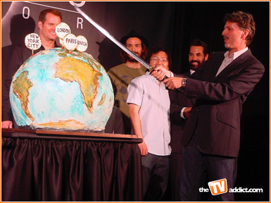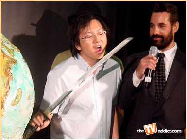 And what ever happened to that giant globe looking cake? Tim Kring was handed the “weapon of choice” to cut the cake, Hiro’s katana sword. Hayden Panettiere who was standing next to the sugary iced Earth told Tim to be careful with the over-sized knife, that she wasn’t really indestructible. The cast laughed and the sword plunged in somewhere around Munich. The cake was delicious, I saved you a piece. ![]()