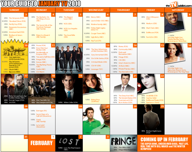 And here, as usual, to help you keep track of 78 different new and returning favorites (Yes, we counted. Yes, we have ‘issues’) is theTVaddict.com with your downloadable and printable guide to January TV 2010. Available at the following links as both a High Quality PDF or JPG.