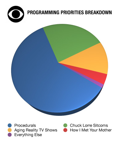 Inspired by last week’s 30 ROCK in which Jack Donaghy revealed NBC’s not-so-secret “Programming Priorities Breakdown,” theTVaddict.com is proud to present our own spin, with today’s target… err, we mean subject being: CBS. ![]()