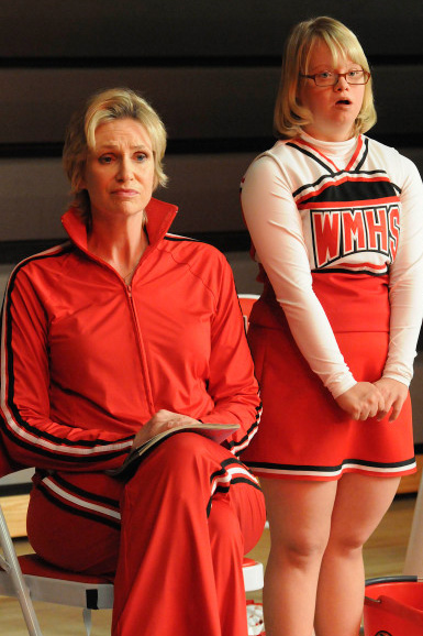 Sue suffers a devastating loss with her Cheerios after the Super Bowl episode where she becomes very depressed, kind of kind of dangerously depressed, where she’s more violent than usual. Enter New Directions, who invites Sue to join the Glee Club to get rid of her depression through song. I’m actually in the Glee Club for a while.