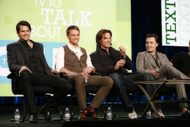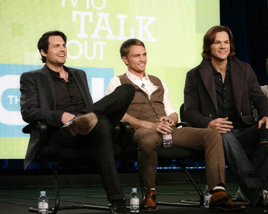 3:25PM: Padalecki believes his co-star Jensen Ackles should be on the “Bad-Ass Boys of the CW” panel, and would be, except that he’s busy working. Said Padalecki, “I’m here representing the both of us.” Adds Polaha, “But who would win in a fight?” Counters Padalecki, “Well, seeing as though he’s not here to defend himself… I’d totally kick his ass!” Jokes Bethel pointing to the door, “Ladies and gentlemen, Jensen Ackles.”