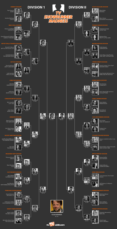 I can’t tell you how surprised, shocked and delighted I am to have won the Showrunner madness poll, especially given the tremendous competition I was up against. But all thanks must go to our loyal and passionate Castle fans who made it all possible. You guys rock.