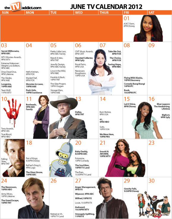 Are you worried that the next few months will offer little more than a depressing mix of reality and repeats? Wondering if now might be the time to become one of those “cord cutters” you’ve been hearing so much about in the media? Well, before you think of taking extreme measures, consider this: Thanks to the return of Aaron Sorkin (HBO’s NEWSROOM), Amy Sherman-Palladino (ABC Family’s BUNHEADS) and a plethora of other exciting options (FALLING SKIES, DALLAS, TRUE BLOOD, SAVING HOPE, LOUIE, among many, many others ), Summer on the small screen has never been so sizzling. But hey, don’t take word for it, check out this comprehensive June 2012 TV Calendar for yourself available at the following links as a High Quality PDF or JPG. ![]()