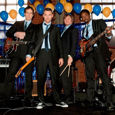 BRIAN: I think the answer lends itself to what we were just talking about. We can play comedy songs, which only kind of last for so long, or we can stick with the element of what the show is, which is that our job is to make this believable. Our job is to make this band honestly the most kickass wedding band anybody has ever seen. And I’m just saying that alone there’s comedy in that. Like they’re at a stadium-style wedding band. I mean, you just never hear or see anything like that, let alone sit at a wedding, and hear these amazing grand songs, and have pyrotechnics and confetti cannons going off, and throwing guitar picks out to the crowd.