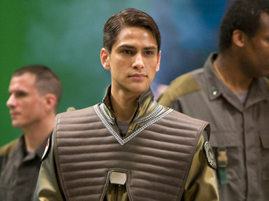 DAVID: I certainly think we had every intention of exploring that interesting conflict between the William Adama who’s committed himself to fighting in a war, whose father we’ve come to know in CAPRICA, might have a very strong opinion against. And in the show that we’re watching now in BLOOD & CHROME, in the pilot we see an off-hand reference to this idea that William’s father was a mob lawyer and that maybe strings were pulled to create certain opportunities for Adama. Those are definitely interesting and complex relationship trends that we want to explore. In fact, we went to great lengths with BLOOD & CHROME to not be cute about too many nods and winks to characters from BATTLESTAR and CAPRICA. At one point, there was a discussion about having young William Adama in the hangar deck maybe bump into some young school teacher who is getting a tour of the BATTLESTAR GALACTICA. And she introduced herself as Laura and they sort of move past each other and then I just thought, ‘I don’t want to be that cute.’ I don’t want to be that literal with it, and if we’re going to do stuff like that, we’ll save that kind of thing for later. There are a number of little Easter-egging nods to the BATTLESTAR faithful that anyone watching the DVDs or seeing this online will be able to recognize. But I think one of the things that will be less resistance to is to think about, do we Esai Morales who played William Adama’s father, to reprise his role in some capacity in a future episode? Do we show some of that conflict and strain between father and son and some of the uniquely kind of contradictory impulses that a mob lifestyle and military lifestyle sort of present? That’s all really rich storytelling—topsoil for us—to pursue if we get the chance to go forward.