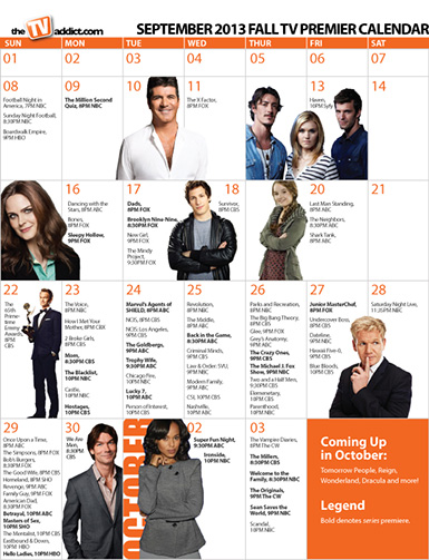 After countless hours of painstaking research and time spent in front of the computer, theTVaddict.com has finally come to the conclusion that there is one —and only one — positive to the end of yet another fantastic summer: The new Fall television season has finally arrived! And here to help ensure you don’t miss a moment of upwards of sixty plus season and series premieres is theTVaddict.com’s now world-famous printable calendar. Accept no substitutions or imitations! Simply click on either of the following links: High Quality PDF or JPG, and enjoy. ![]()