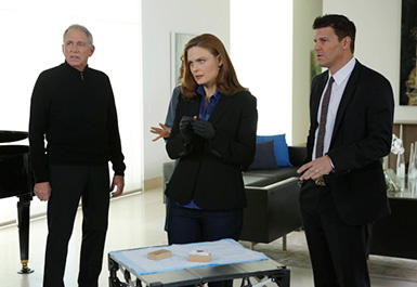 This just in, new episode photos and previews from the Friday January 31st episode of BONES. Direct from FOX, “The Jeffersonian team investigates the murder of Lauren Frank, a kidnap victim whose remains were found buried at a park. But when they discover the unhappy relationship that Lauren had with her stepmother, the team starts to think the killer was someone closer to the girl than expected. Meanwhile, Hodgins uncovers a shocking secret about his family and Brennan and Booth face a common couples’ dilemma – whether to co-mingle their funds.”