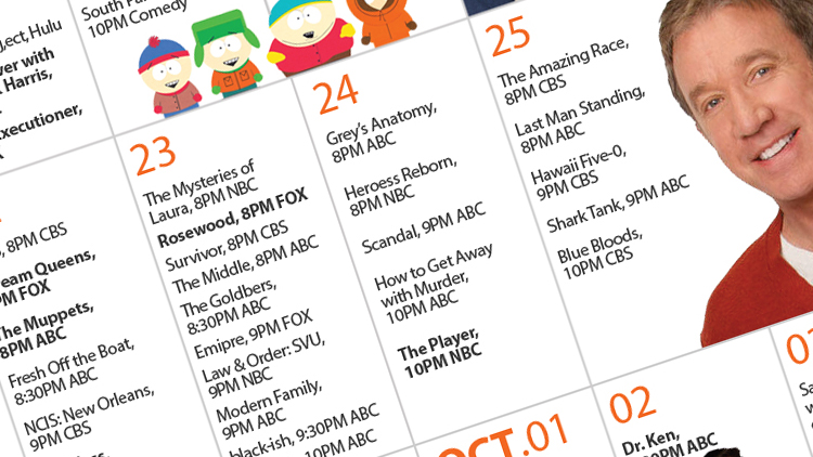The tradition continues! Just in time for the start of the 2015 television season comes your definitive Fall TV 2015 calendar! Accept no substitutions or imitations! Ensure you don’t miss a moment of upwards of sixty plus season and series premieres with theTVaddict.com’s now world-famous printable calendar. Simply click on either of the following links: High Quality PDF or JPG, and enjoy. ![]()