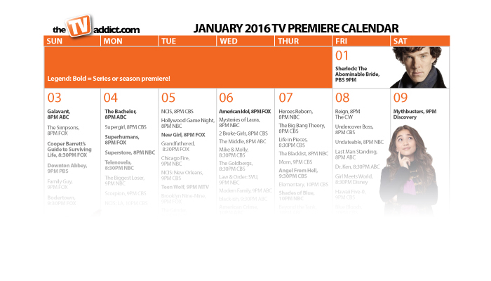 And here, as usual, to help you keep track of the multitude of premieres, Award Shows, and finales is theTVaddict.com with your downloadable and printable guide to January TV 2016. Available at the following links as both a High Quality PDF or JPG. ![]()