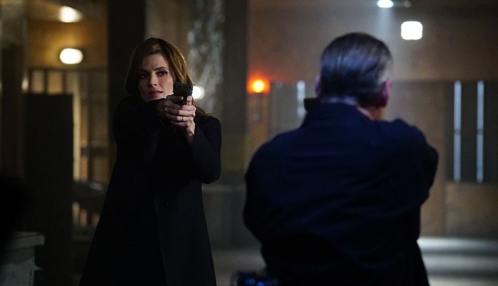 But, after Lucky Jack is confronted by his daughter (and her gun), he truthfully admits that he didn’t have anything to do with the death of her boyfriend. Beckett then has to talk the girl down from pulling the trigger, but she eventually relents and they go back to the academy to try and find some answers. It’s here that Beckett is talking to her old recruit officer when she gets the call from Espo saying that they tracked the car outside of the victim’s last known location to the very officer Beckett is talking to. She pulls her gun and he does the same, but after a quick confrontation he says that he hasn’t driven his car in days — in fact, he lent it to a friend of his.