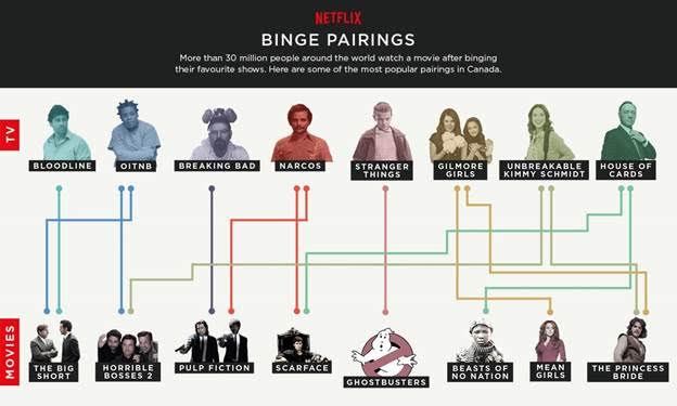 When looking globally into what movies most often followed some of today’s top series, interesting pairings emerged. After watching HOUSE OF CARDS, some members moved to BEASTS OF NO NATION. In other cases, viewers of BLOODLINE turned to THE BIG SHORT after a series binge. And Vince Gilligan’s cinematic nod to Tarantino in BREAKING didn’t go unnoticed with watchers moving on to PULP FICTION after finishing with Walter White. Meanwhile, fast talking fans of GILMORE GIRLS keep their pop culture references fresh with CLUELESS and MEAN GIRLS.