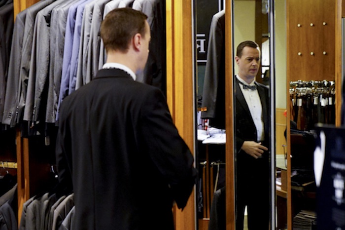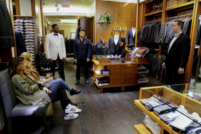 As the team watches Tim walk the tuxedo catwalk, Delilah tries to extricate herself from the mound of wedding invitations at home.