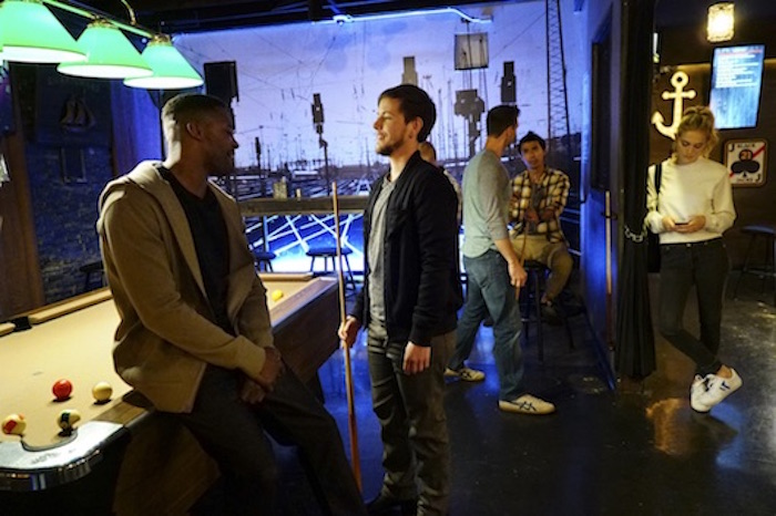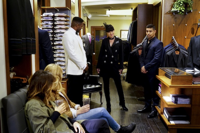 Torres (Wilmer Valderrama) and Reeves (Duane Henry) try to out-stud each other as Bishop (Emily Wickersham) and Quinn (Jennifer Esposito) knock back champagne and admire the fashion show.
