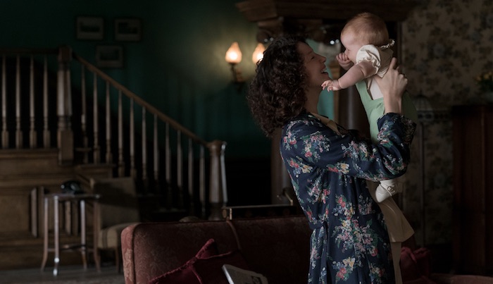 Brianna and Frank. One might forgive Frank for feeling a bit cold towards the little girl who isn’t really his, but Balfe actually says this is not the case this season: “I think it’s actually easier for Frank to forget about Jamie, because he’s never met him. For him, looking at Brianna, obviously there’s red hair but he doesn’t look at her face and see Jamie. Whereas every time Claire looks at Brianna it’s such a strong reminder of a man that she knew so well. But for Frank he has no context for that. What I love about Diana [Gabaldon]’s depiction of their family dynamic is that in many ways she flipped the script and Claire became…maybe not the primary breadwinner, but definitely the workaholic or the person who was more engaged in her career. And Frank became pretty much the primary caregiving in the house.”