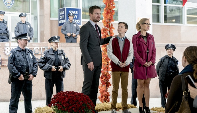 “The thrust of our show for the first five years is [Oliver] being the Green Arrow and growing into what that means and trying to learn from [his] experiences,” Amell explained. And, here we are….I do think that Oliver’s relationship with William, it has changed things forever. I don’t know where it ends up, but it’s not like we are going to erase him having a son. It’s now part of what we are doing.” When asked about how well Felicity fits into this new little relationship that Oliver is creating with his son, Amell said “I like her being part of this dynamic. I think William’s character is at a nice age, so that we’re not getting into, ‘Okay, who is going to change a diaper at 3 a.m. in the morning?’ It’s more like he’s a young adult, he’s mature, he’s having his moments, but he’s adjusting well and she’s helping with that. That’s been great.”