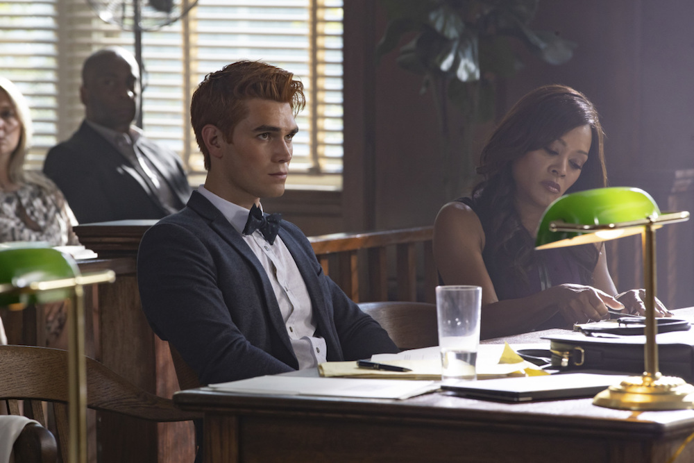 Archie Andrews will stand trail when season 3 of RIVERDALE begins. Thanks to Hiram Lodge, the teen was arrested for murder at the end of the second season and Penelope Ann Miller is joining the cast as District Attorney Ms. Wright, who will be prosecuting Archie. On his side of the courtroom, Archie has his mother and former mayor Sierra McCoy defending him. Elsewhere in the season premiere photos, we see Betty, Jughead and Veronica joining Archie at the lake, where the group is enjoying the last few days of summer and trying to forget their problems. The only good news here is that both relationships look to be going strong.