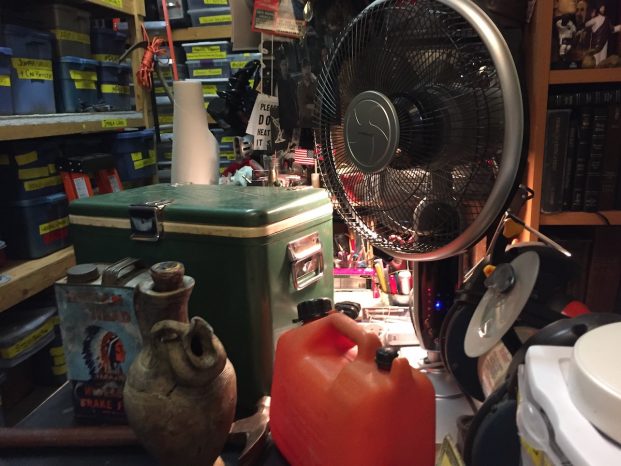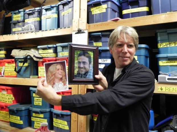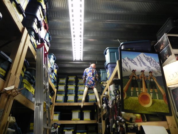 Slide 1 of 732011 (Season 7). The props room is full of wild and wacky items, including a blow-up doll. Stacked floor to ceiling, the boxes contain all sorts of items from throughout the years.