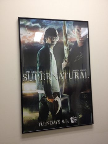 Slide 1 of 732012 (Season 8). An old poster of Jared and Jensen decorating the walls of the SUPERNATURAL production offices.