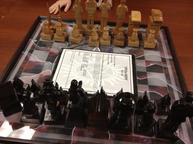 Slide 1 of 732012 (Season 8). A fan designed an absolutely gorgeous chess set for the SUPERNATURAL cast and crew and it was placed in a conference room in the production offices.