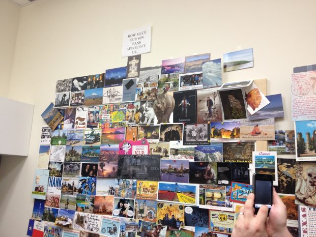 Slide 1 of 732012 (Season 8). The SUPERNATURAL crew had received thousands of postcards from fans over the years and they hung them on the wall of the production offices.