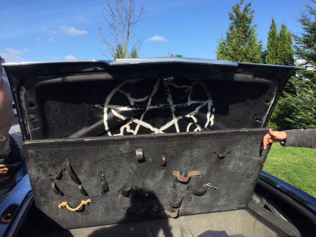 Slide 1 of 732015 (Season 11). The trunk of the Impala, with the sigil painted on. The weapons aren’t kept in the trunk unless needed as they’re usually stored in the props room.