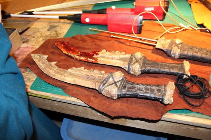 Slide 1 of 732016 (Season 12). The props department created clean and “bloody” versions of the First Blade, as well as a version that allows them to “stab” someone.