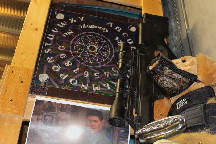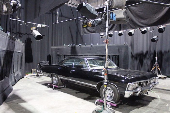 To celebrate the final three episodes of the show, we’re taking a look back through our archive of set visits. First up is a look at props, wardrobe, the production offices and the show’s most famous object: the Chevy Impala. What follows are behind the scenes photos and tidbits about some of SUPERNATURAL’s most recognizable objects and clothes. We also have a look at the show’s iconic sets and then (the week of the finale) a look at outtakes from our interviews with the show’s stars over the years.