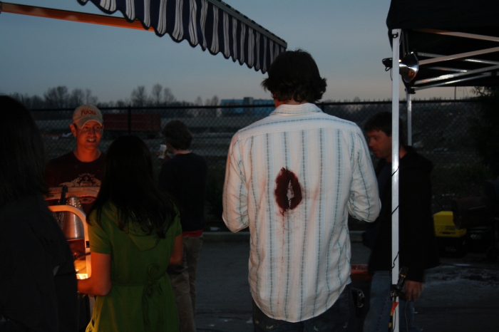Slide 1 of 732007 (Season 2). Jared Padalecki was on set for the filming of the two part season 2 finale “All Hell Breaks Loose”. You can see the “stab wound” in his shirt where Jake stabbed him in the back and killed him.