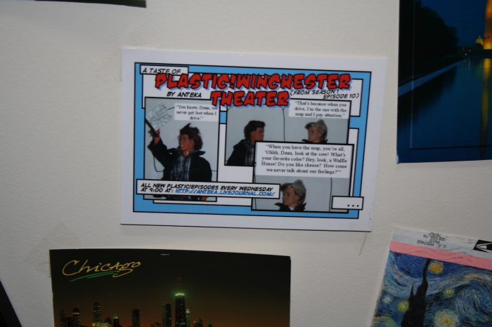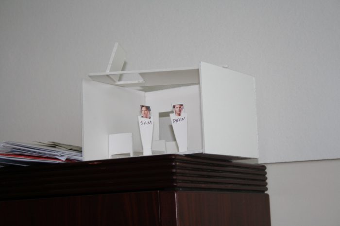 Slide 1 of 732007 (Season 2). Some “paper dolls” of Sam and Dean behind the scenes in the production offices.