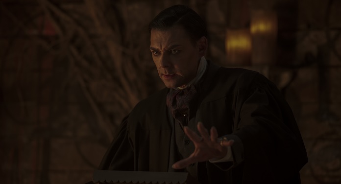 Father Blackwood. Sabrina signing the book means that Blackwood will have to “deal with Sabrina in his day-to-day life whereas before it was she was kind of at a distance. Now he’s responsible for her pastoral care as the headmaster of the academy. So she’s much more closer into his orbit than before,” Coyle said. And as for whether he sees her as a genuine threat to him, Coyle admitted “Yeah, she definitely is. His personal feelings aside, he can recognize that there’s something about her that is not ordinary That the Dark Lord has a major interest in her in a way that he would not have an interest in a regular standard the teenage witch.” As for how Blackwood continues to adjust to be a father, Coyle said that “I think it’s kind of like holding a mirror up to Blackwood in terms of his ego and his vanity.” And as one of the few people who truly knows Ms. Wardwell, Coyle hinted that she and Blackwood “don’t see eye-to-eye in the way that they carry the Dark Lord’s message. They have very different personal agendas, which keep them apart and keep them at loggerheads, so it’s not like they’re working [together]. They’re on the same team in a way, but they’re not working together. They’re working at odds to one another.”