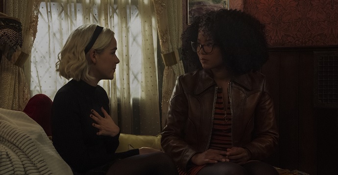 The Weird Sisters and Sabrina. “I think it was a little bit a tease of [the Weird Sisters] kind of letting [Sabrina into our group in season 1], but then still, throughout [part 2], you will see us kind of going between helping her and then not helping her. And I think there is still, at the end of the day, that grudge against her for her love for mortals. So that theme still proceeds throughout [part 2]. She does join us in certain aspects, but is she really part of our crew? No. We’re still the three Weird Sisters that kind of stick together,” Rudolph said. Shipka also said that “I think that the Weird Sisters and Sabrina have always had a really complex relationship. That definitely doesn’t die in the second season. We definitely see a lot of them, but I don’t think that it’s smooth 24/7. It’s no Rosalind/Susie[/Sabrina] relationship. It’s definitely something a bit more complicated and rocky, which is interesting. But, we do see a lot of them.” And when asked specifically about Prudence and Sabrina, Shipka said that “I think that there’s always been a minor power struggle between Prudence and Sabrina to a certain extent. The way it plays out — I don’t want to spoil too much or give too much away — but they definitely have their moments where they support each other, and then there are moments where they feel like they’re really against each other. I think it’s just sort of a rocky ride for them.”